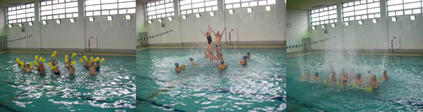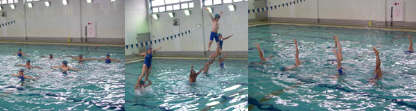 水中演技では、1曲目のサーフィンUSAでいきなり大ジャンプを決めて会場を盛り上げます。競技シンクロ経験者のコーチがいるせいか、バレーレッグや倒立の足がとてもきれいなのが印象的でした。 |
