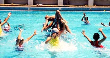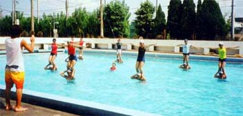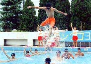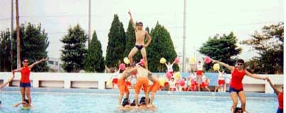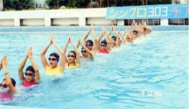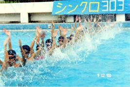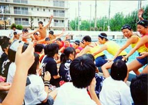 | ★WBを見て感動して「うちらも!!」って事になったんですが文化祭でプールで シンクロなんてなにせ学校創立初めての事でプールの使用許可から始まってほんとに 大変な事ばかりでした。 ★夏休み前から振り付けを考え初めて、プールでの練習は夏休みからでした。 しかし夏休みも水泳部との兼ね合いもあり数回しかプールには入れずなんといっても 受験生ということで全員がそろうことはなかったです・・ ★9月になってテストが終わってからはさすがに焦りだしまだ最後まで決まっていなかった 振り付け決めやプールでの本格的な練習に!! ★本番前日まで変更を繰り返し本当に不安だらけでしたが本番では成功率のかなり 低かった3段タワーも全部見事成功であたし達もほんとに感動でした!! ★特に苦労した所は教えてくれる先生もいなくて振り付けも全部自分達できめて・・・ とにかく全部大変でした!! ★その甲斐あってたくさんのお客さんに見ていただく事ができました。プールの動員数は 2000人を大きく上回り近所のマンションや中学校からもたくさんの人が見てくれました! 文化祭への一般入場者もシンクロ効果で今までにない数を記録!! ★感動で涙してくださる方もいました!! ★おかげ様で全ての賞を総ナメしちゃいましたー!!(史上初!) ★本当に大変だったけど一生の思い出になりました。