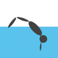 (2)おもいっきり後ろへジャンプ ・手をバンザイするように動かしながら後ろへジャンプします。 ・あごを上げて身体を反らせて。 ・足が開かないようにそろえて。 ・ジャンプの後、背中からバシャッと落ちないように、波に乗るような感じでスーッと滑らかに。 |